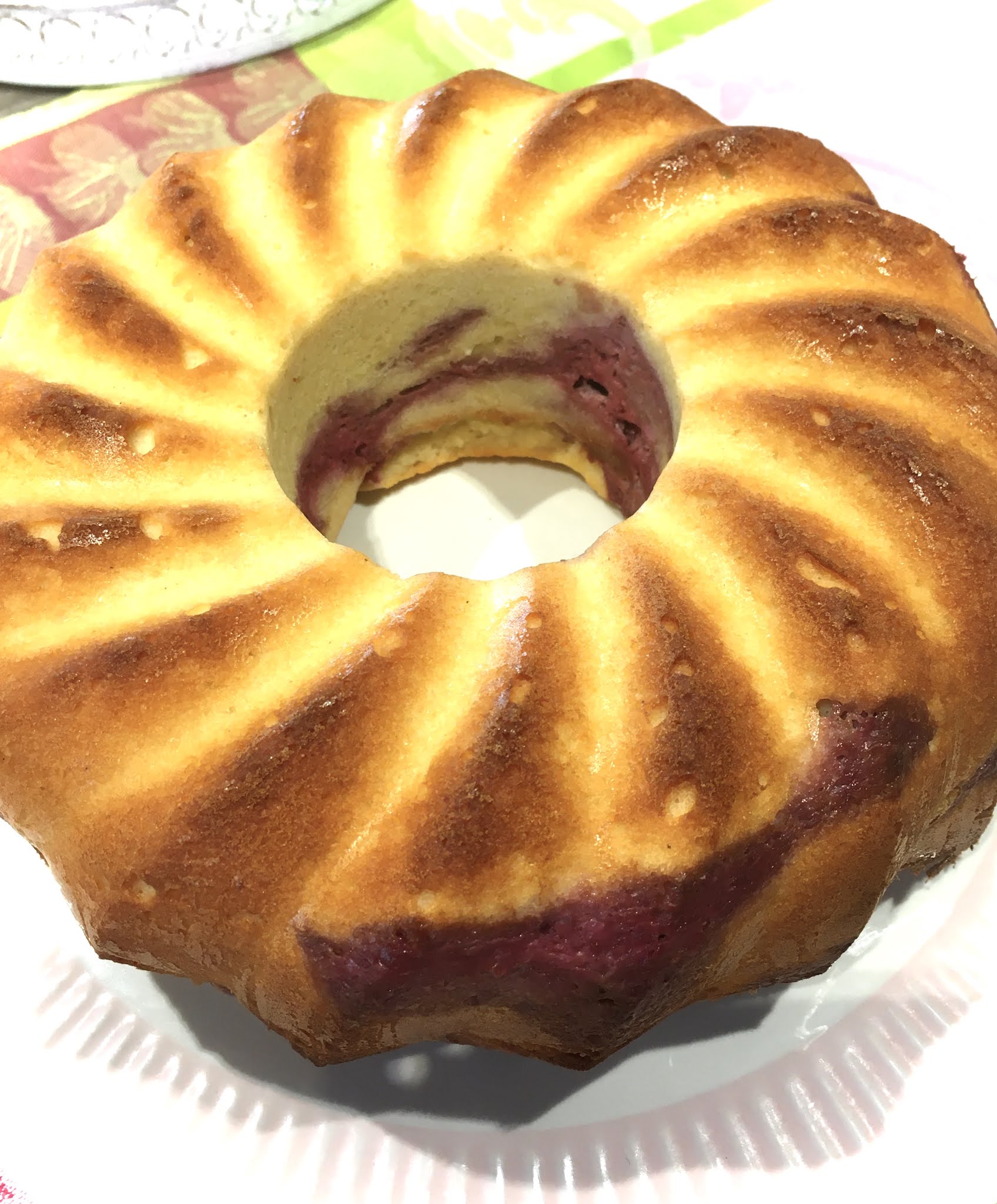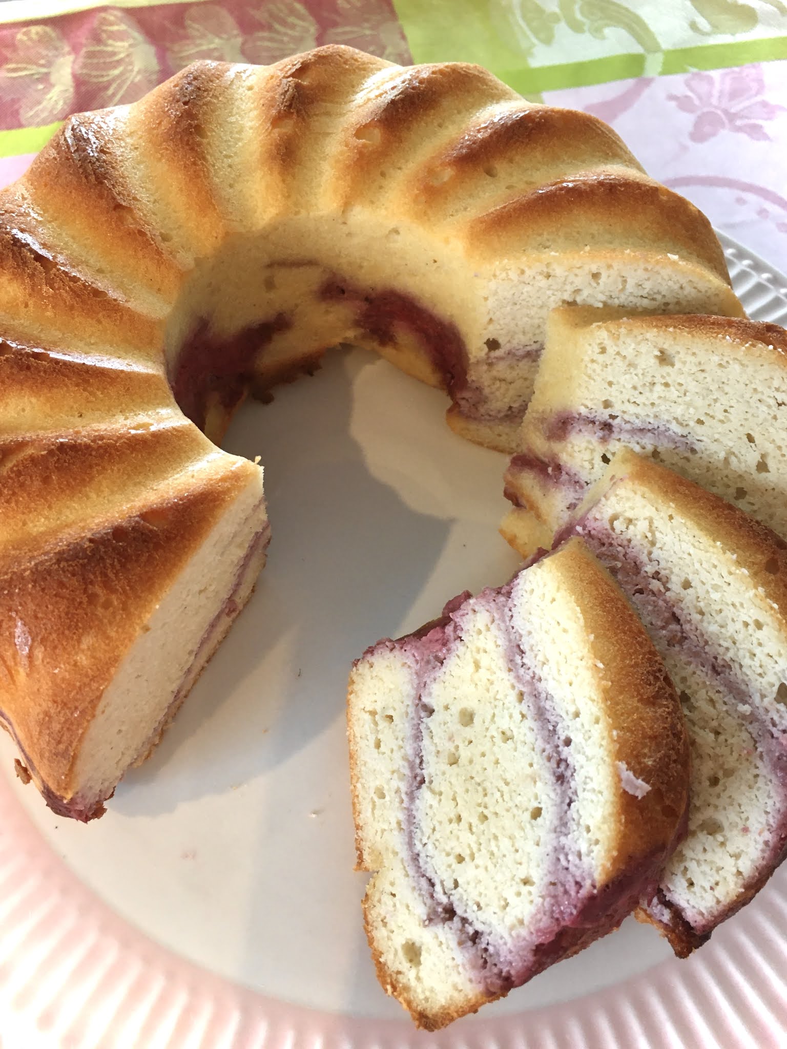 Gugelhupfform einbuttern und 1/3 des Teiges hineingeben. Die Hälfte der Beeren-Schmand Creme in Klecksen auf dem Teig verteilen. Ein weiteres Drittel des Teiges darüber geben, Beeren-Schmand auf den Teig klecksen und den restlichen Teig darüber geben.