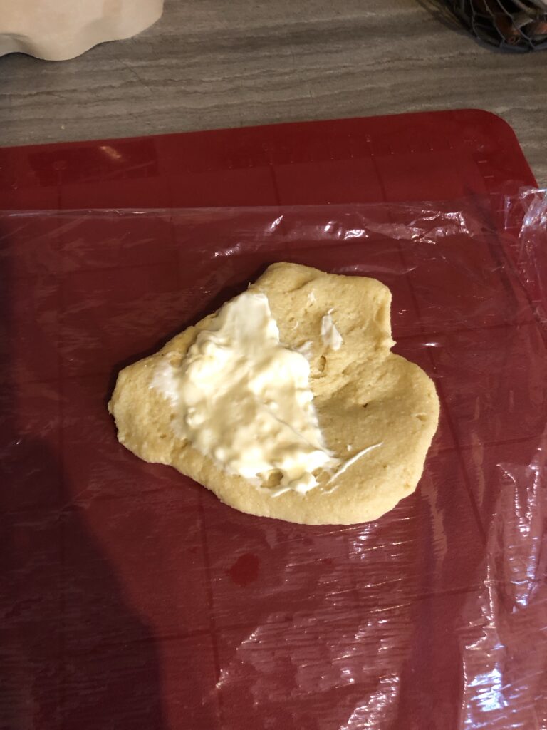 Mit angefeuchteten Händen Kreppel formen, etwas platt drücken und auf einer Sichtfolie ruhen lassen.