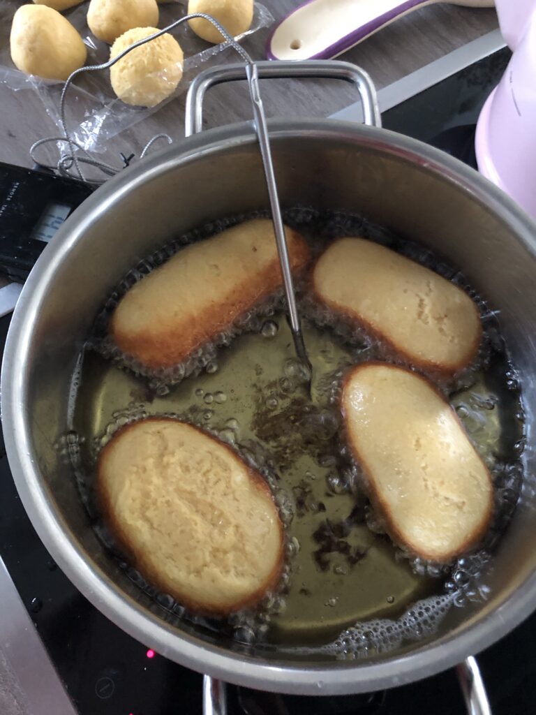 Öl im Topf auf 145°C erhitzen und immer 3-4 Kreppel ins Öl geben. Nach 4 Minuten mit einem Schaumlöffel wenden und für weitere 4 Minuten frittieren.