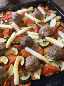Rinderhackfleisch in einer Schüssel mit den Eiern, Salz, Pfeffer und dem Oregano vermengen und zu kleinen Bällchen (ca 12 Stück) formen und zwischen den Zucchini-Tomaten auf dem Backblech verteilen.