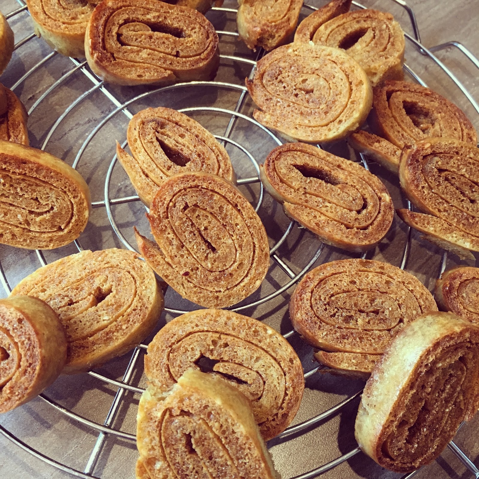 Den Boden nach Ablauf der Backzeit aus dem Backofen holen und mit samt dem Backpapier auf ein feuchtes Küchentuch legen. 2/3 der Zimt-Karamell-Creme gleichmäßig auf den Teig streichen und mit Hilfe des Küchentuches und Backpapier ganz eng über die kurze Seite zusammenrollen. Ca 2 cm dicke Streifen schneiden und auf ein Backblech mit Backpapier legen. Mit der restlichen Zimt-Karamell-Creme bestreichen und so lange im Backofen weiterbacken bis die gewünschte Bräune erreicht ist, ca. 10 Minuten.